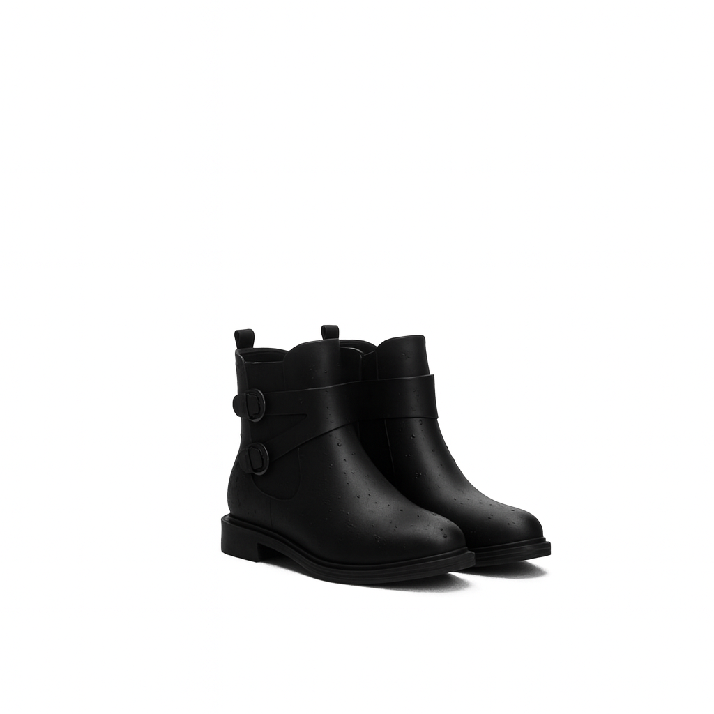 A sleek black ankle boot designed with a minimal matte finish and subtle buckle detailing